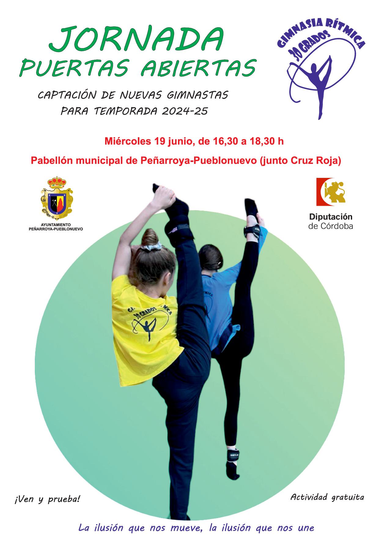 Recibimos invitación destinada a las gimnastas de Gimnasia Rítmica Pozoblanco para participar en la JORNADA DE PUERTAS ABIERTAS que llevará a cabo Gimnasia Rítmica 30 Grados en el pabellón municipal de Peñarroya-Pueblonuevo el miércoles 19 de junio de 16,30 a 18,30 h. Es una jornada de captación pero puede venir muy bien para toda aquella gimnasta que tenga interés por participar en competición la próxima temporada con Gimnasia Rítmica Pozoblanco. Toda quien lo desee podrá participar del entrenamiento junto a las gimnastas de competición del Club, independientemente del nivel que posea. Una oportunidad para probarse.
